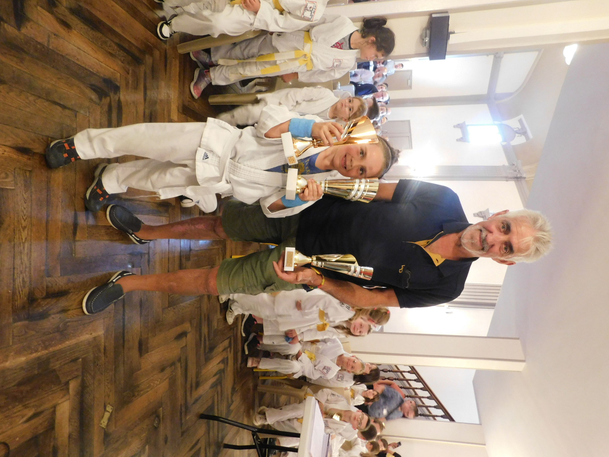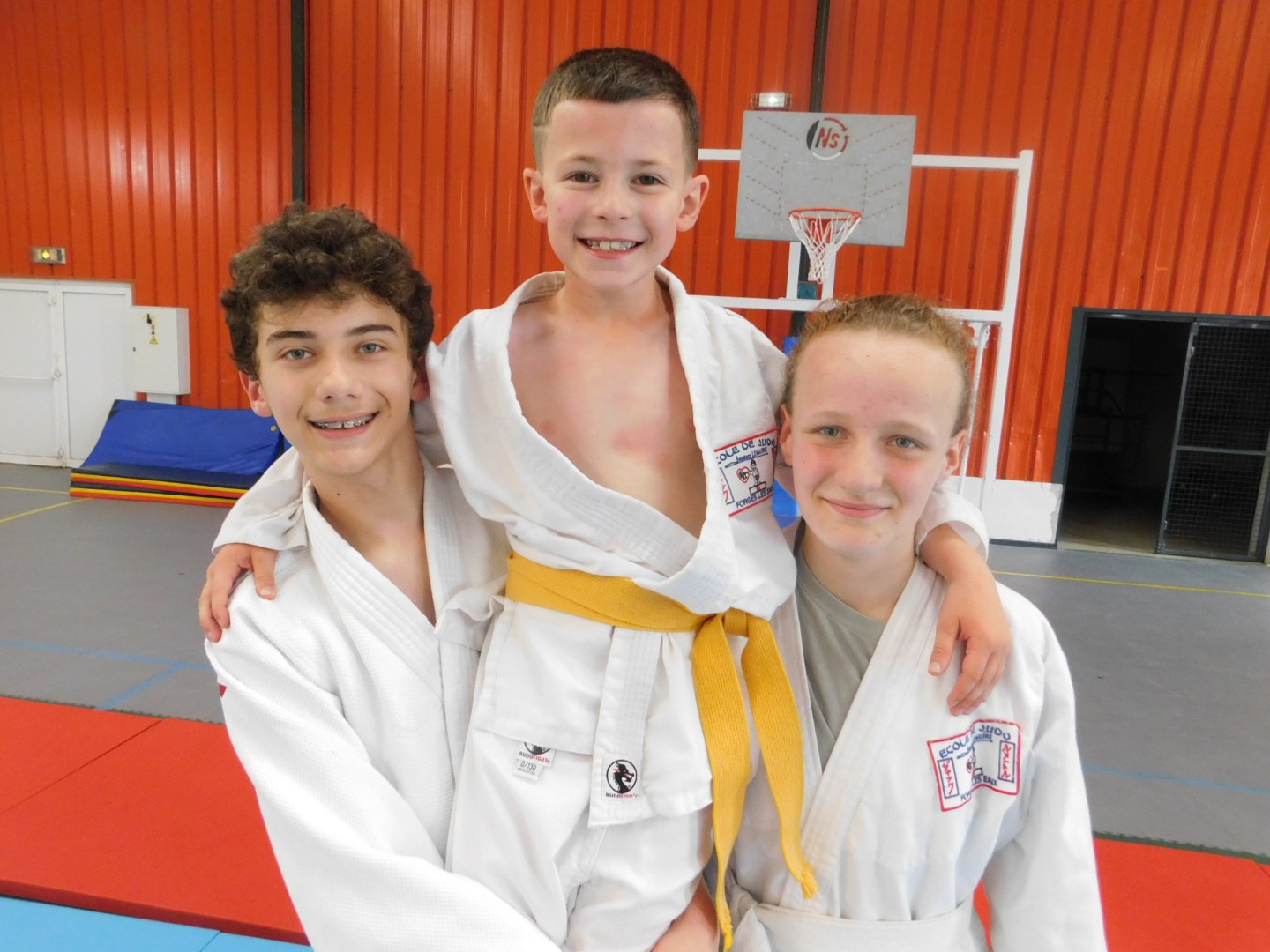Photos : les judokas de l’EJJL Bosc le Hard heureux sur les tatamis lors du dernier cours en compagnie de leur président de club : Grégory Manry qui vient d’être papy et les trois lauréats du challenge 2025